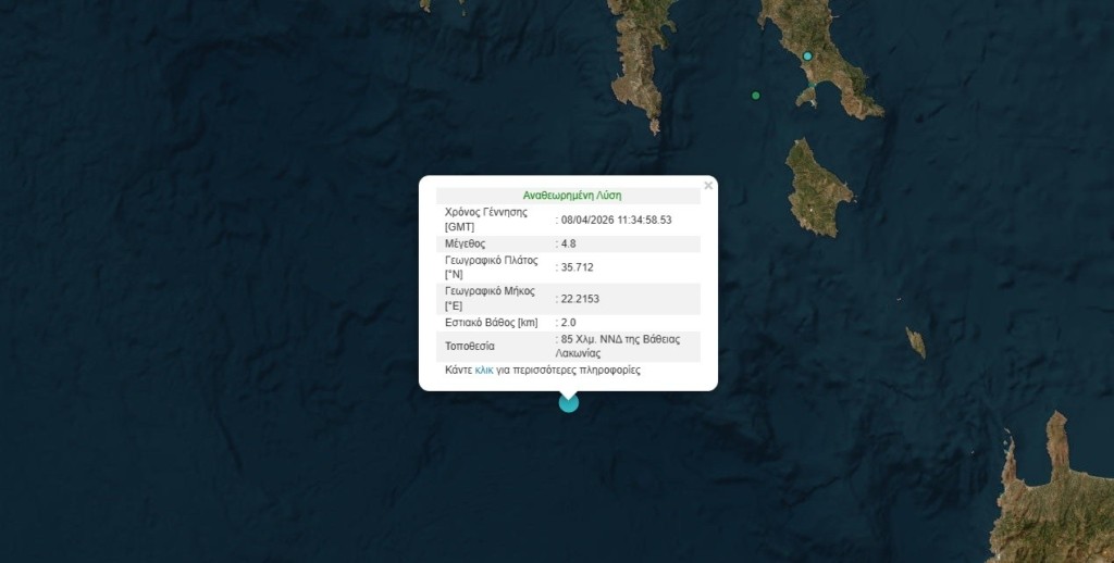 Σύμφωνα με το Γεωδυναμικό Ινστιτούτο του Εθνικού Αστεροσκοπείου Αθηνών, η σεισμική δόνηση είχε επίκεντρο 85 χλμ. νότια-νοτιοδυτικά της Βάθειας Λακωνίας, με το εστιακό βάθος να υπολογίζεται στα 2 χλμ..