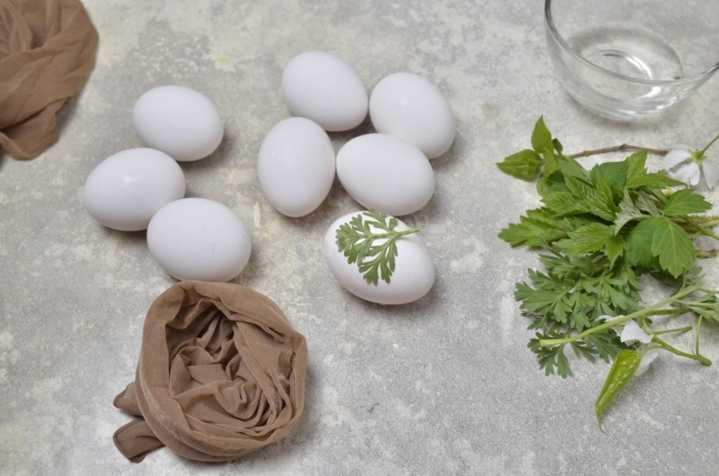 3. Κόψτε τις άκρες από ένα καλσόν (τα δάκτυλα και το σορτς). Δέστε ένα κόμπο στην άκρη της κάλτσας και τοποθετήστε το αυγό με το βότανο, προσέχοντας να μην γλυστρίσει και χαλάσει το σχέδιο ή να τσαλακωθεί το βότανο. Δέστε ένα κόμπο, τεντώνοντας το ύφασμα. Συνεχίστε με το ίδιο τρόπο, τοποθετώντας 4 αυγά σε μια κάλτσα.
