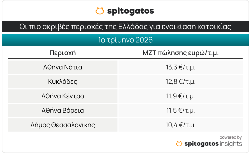 Το Spitogatos Insights εξέτασε την εξέλιξη των ΜΖΤ πώλησης και ενοικίασης κατοικιών στην Αττική κατά το 1ο τρίμηνο του 2026. Σύμφωνα με τα πρόσφατα στοιχεία, τα Νότια Προάστια σχεδόν μονοπωλούν το top 5 των πιο ακριβών περιοχών της Αττικής, με τη Βουλιαγμένη να βρίσκεται στην κορυφή με ΜΖΤ 7.333 ευρώ/τ.μ., ενώ ακολουθούν η Βούλα, το Ελληνικό, η Γλυφάδα και το Ιστορικό Κέντρο της Αθήνας, όπως φαίνεται στον παρακάτω πίνακα.