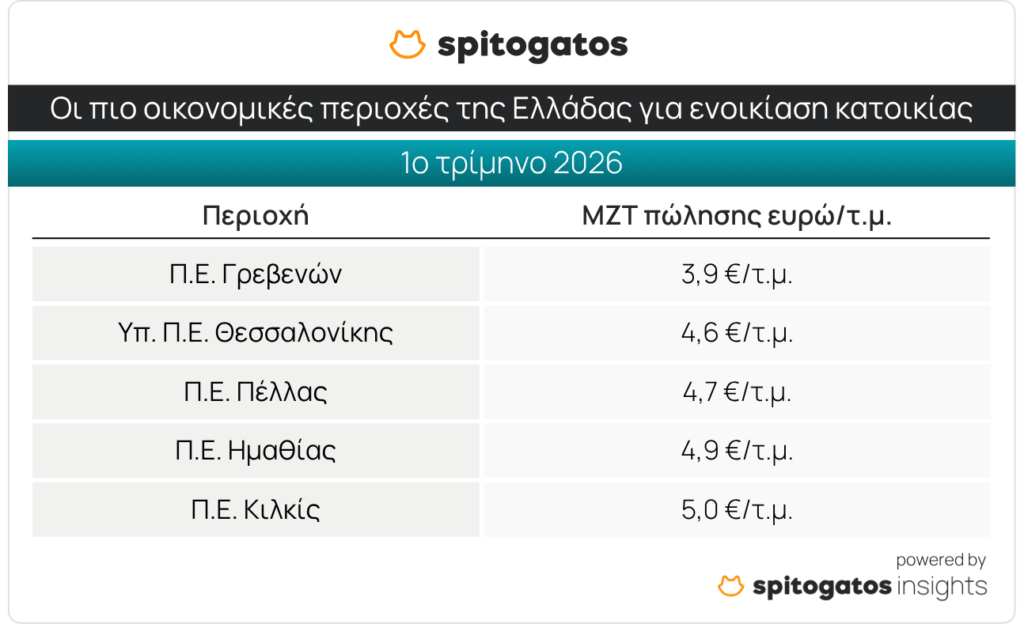 Σε ό,τι αφορά την ενοικίαση κατοικίας, οι πιο οικονομικές περιοχές της χώρας για το 1ο τρίμηνο του 2026 αναδεικνύονται η Π.Ε. Γρεβενών με ΜΖΤ ενοικίασης στα 3,9 ευρώ/τ.μ., ενώ ακολουθούν το υπόλοιπο της Π.Ε. Θεσσαλονίκης, η Π.Ε. Πέλλας, η Π.Ε. Ημαθίας και η Π.Ε. Κιλκίς.