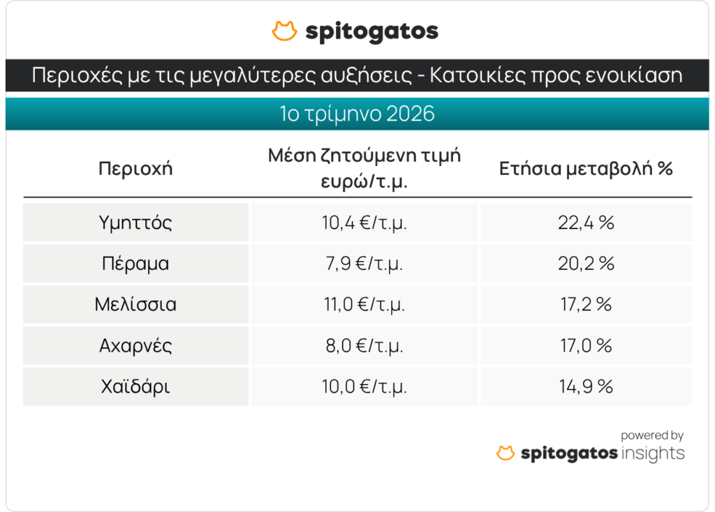 Οι σημαντικές ετήσιες αυξήσεις που σημειώνονται στις ζητούμενες τιμές πώλησης σε Ταύρο και Δάφνη, καθώς και στις ζητούμενες τιμές ενοικίασης σε Πέραμα, Αχαρνές και Χαϊδάρι, υπογραμμίζουν το αυξανόμενο ενδιαφέρον αυτών που αναζητούν κατοικία — είτε προς πώληση είτε προς ενοικίαση — σε λιγότερο δημοφιλείς αλλά πιο οικονομικά προσιτές περιοχές.