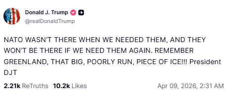 «Το ΝΑΤΟ δεν ήταν εκεί όταν το χρειαστήκαμε και δεν θα είναι εκεί αν το χρειαστούμε ξανά. Θυμηθείτε τη Γροιλανδία, αυτό το μεγάλο, κακοδιοικούμενο κομμάτι πάγου!!! Πρόεδρος DJT», έγραψε χαρακτηριστικά.