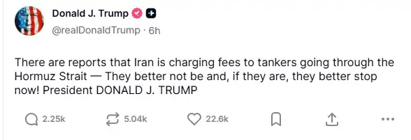 «Υπάρχουν αναφορές ότι το Ιράν χρεώνει τέλη στα δεξαμενόπλοια που περνούν από τα Στενά του Ορμούζ. Καλό θα είναι να μην το κάνουν και, αν το κάνουν, να σταματήσουν τώρα», σημειώνει.