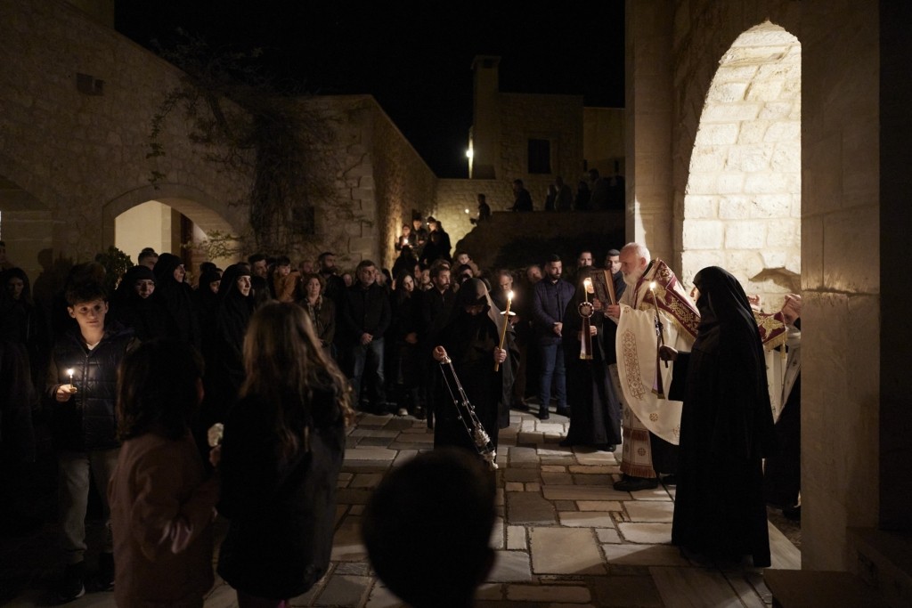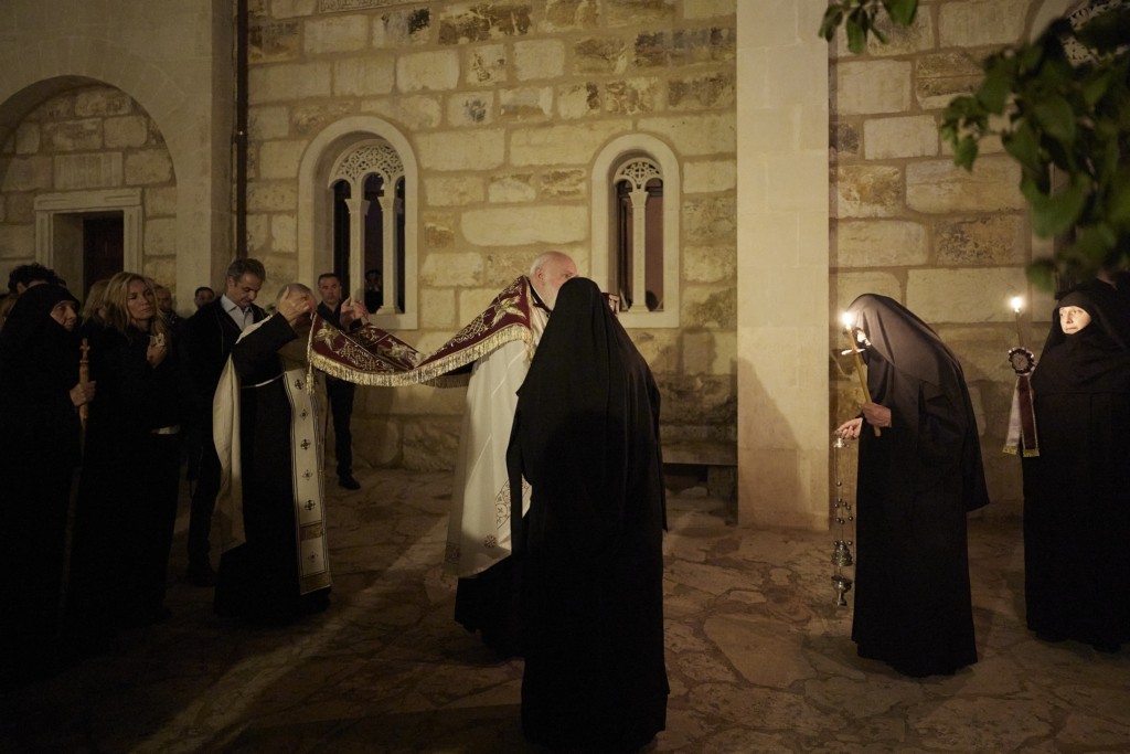 Ο Πρωθυπουργός Κυριάκος Μητσοτάκης, συνοδευόμενος από τη σύζυγό του Μαρέβα Γκραμπόφσκι-Μητσοτάκη, παρακολούθησε την Ακολουθία και Περιφορά του Επιταφίου στην Ιερά Μονή Μεταμορφώσεως του Σωτήρος στα Χανιά.