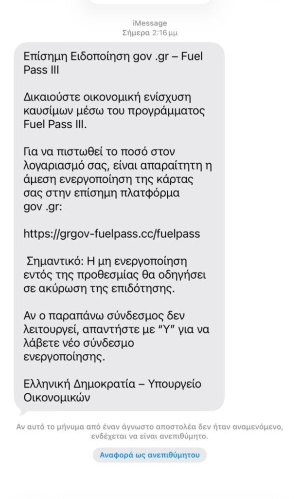 Τα μαζικά ψευδή μηνύματα εμφανίζονται ψευδώς ως επίσημη ενημέρωση της Ελληνικής Κυβέρνησης για το μέτρο του Fuel Pass.