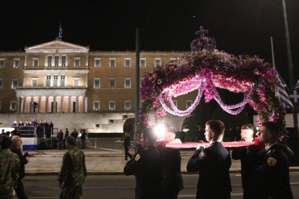Ακολούθησε η περιφορά του Επιταφίου, με τη συνοδεία αγημάτων των Σωμάτων Ασφαλείας και των Ενόπλων Δυνάμεων που απέτισαν τιμές, αλλά και πλήθους πιστών με αναμμένα κεριά στα χέρια. Η πορεία από την οδό Μητροπόλεως κατέληξε στην Πλατεία Συντάγματος μπροστά από το Μνημείο του Αγνώστου Στρατιώτη, όπου είχε στηθεί εξέδρα, πάνω στην οποία χοροστατούντος του Αρχιεπισκόπου Ιερωνύμου τελέστηκε δέηση υπέρ των πεσόντων του έθνους.