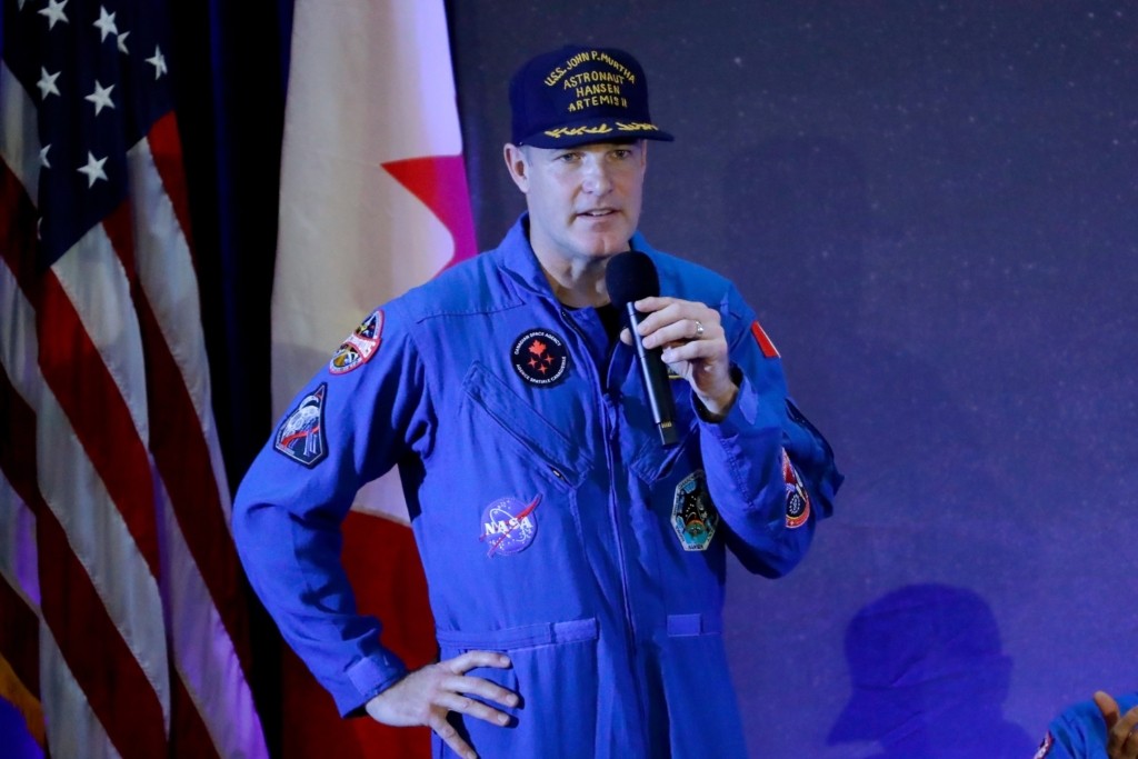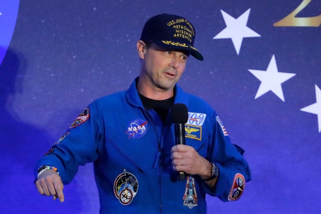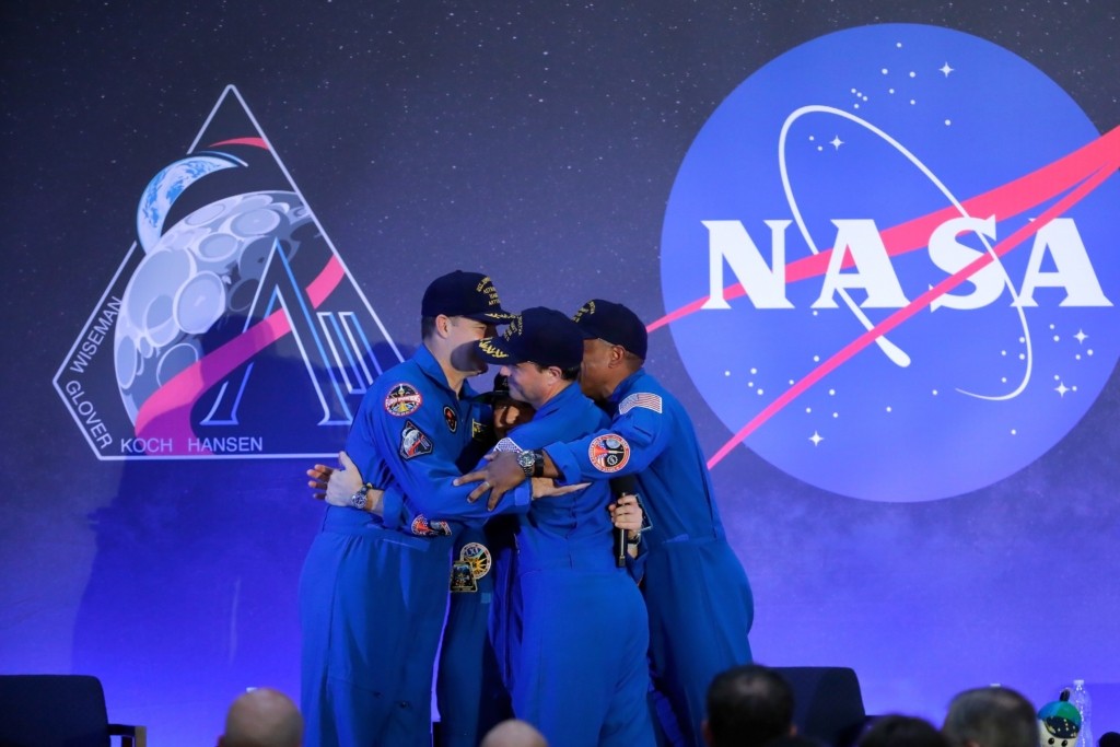 Μετά από μια σύντομη επανένωση με τους συζύγους και τα παιδιά τους, ο κυβερνήτης Reid Wiseman, ο πιλότος Victor Glover, η Christina Koch και ο Καναδός Jeremy Hansen ανέβηκαν στη σκηνή του υπόστεγου, περιτριγυρισμένοι από εργαζόμενους του διαστημικού κέντρου και άλλους προσκεκλημένους.