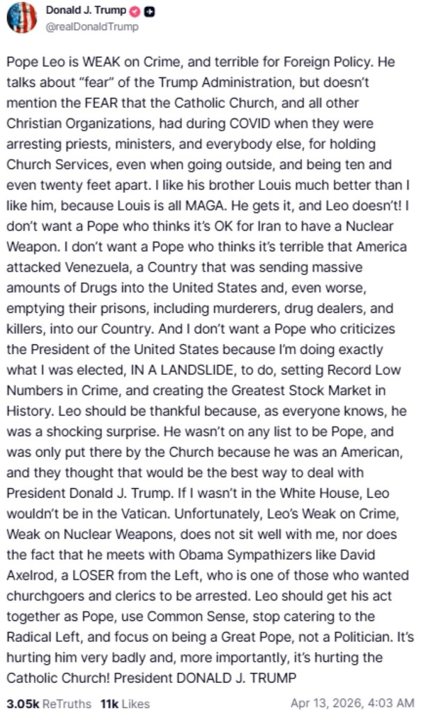 Λίγο νωρίτερα, ο Ντόναλντ Τραμπ δημοσιοποιούσε στον ιστότοπο κοινωνικής δικτύωσης που του ανήκει μακροσκελή ανάρτηση εναντίον του πάπα, προσάπτοντάς του φύρδην μίγδην πως υποστηρίζει το υποτιθέμενο πρόγραμμα απόκτησης πυρηνικών εξοπλισμών του Ιράν, ότι εναντιώθηκε στην αμερικανική στρατιωτική επιχείρηση στη Βενεζουέλα τον Ιανουάριο και ότι συναντήθηκε με συμπαθούντες του δημοκρατικού πρώην προέδρου Μπαράκ Ομπάμα — μεταξύ άλλων.