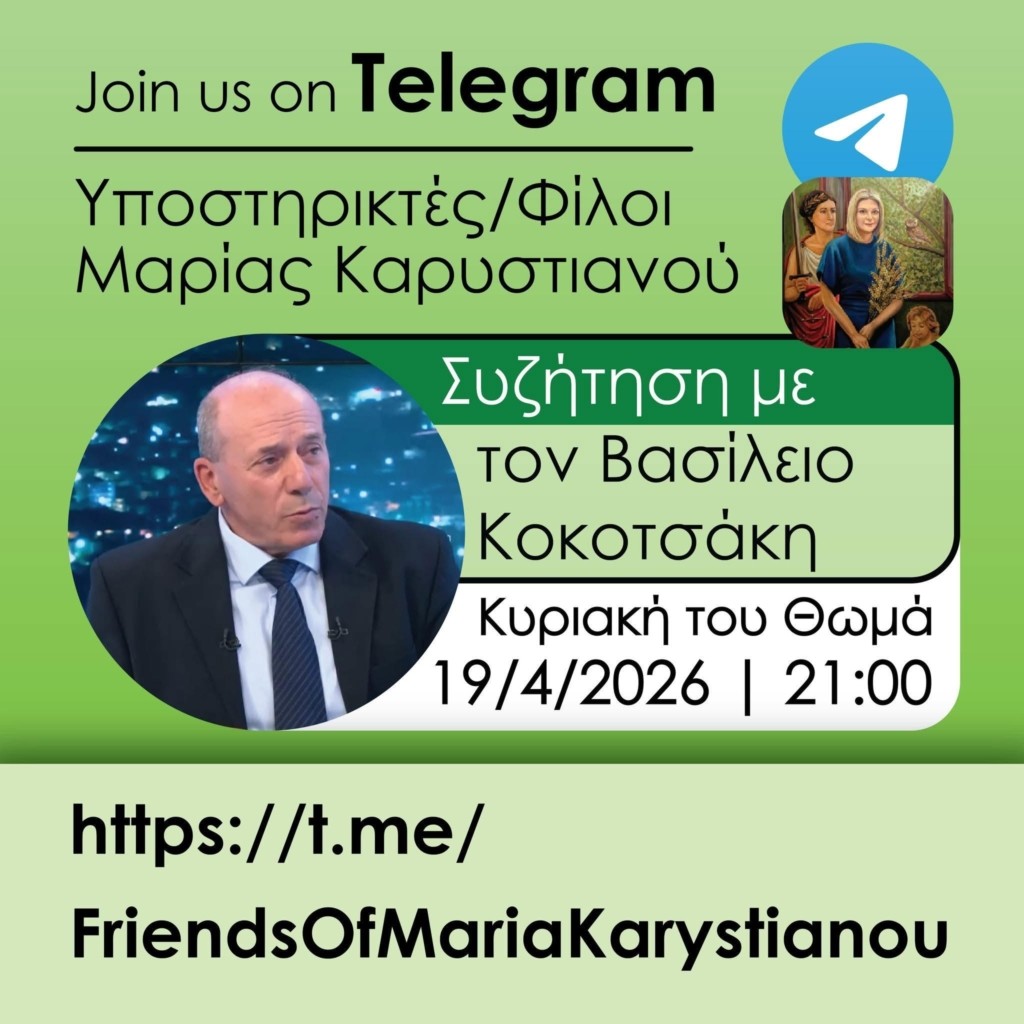 Η κίνηση με το όνομα “Υποστηρικτές/Φίλοι της Μαρίας Καρυστιανού“, διοργανώνουν εκδήλωση – συζήτηση την Κυριακή του Θωμά στις 9 το βράδυ σε κανάλι του telegram με τον Βασίλη Κοκοτσάκη. Ο οποίος έγινε ευρύτερα γνωστός ως πραγματογνώμονας στην υπόθεση των Τεμπών.