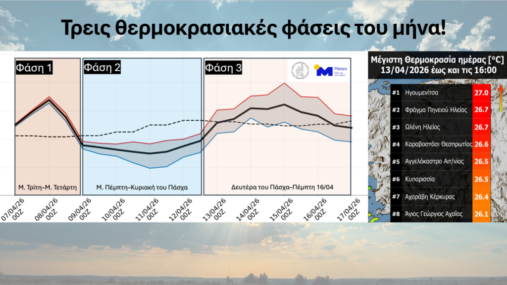 Χρόνια Πολλά σε όλους! Επιστρέφουμε από τις διακοπές του Πάσχα και, παρά το γεγονός ότι οι περισσότεροι γυρίσαμε στις βάσεις μας με έναν ουρανό μουντό, τα νέα από το μέτωπο του καιρού είναι αισιόδοξα. Αν ρίξουμε μια ματιά στην πορεία του υδραργύρου αυτόν τον μήνα, θα δούμε ότι χωρίζεται σε τρεις πολύ καθαρές φάσεις. Αφήσαμε πλέον πίσω μας τη «βουτιά» της δεύτερης φάσης, εκείνο το σύντομο αλλά αισθητό κρύο που μας ανάγκασε να βγάλουμε πάλι τα παλτό την ημέρα της Ανάστασης, και πλέον μπαίνουμε οριστικά στην τρίτη φάση. Σε αυτή τη νέα περίοδο, η καμπύλη της θερμοκρασίας παίρνει την ανηφόρα και σταθεροποιείται σε επίπεδα πολύ πιο πάνω από τα φυσιολογικά για την εποχή, δείχνοντας ότι η άνοιξη εγκαθιδρύεται πλέον για τα καλά.