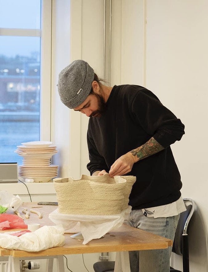 Ο Eyvind Solli εστιάζει στην τεχνική του μακαρονιού, η οποία αναδεικνύει έναν αρχαίο τρόπο κατασκευής αγγείων, επιτρέποντας παράλληλα στα μακαρόνια να λάμψουν ως καλλιτεχνική έκφραση και όχι απλώς ως τεχνική κατασκευής.
