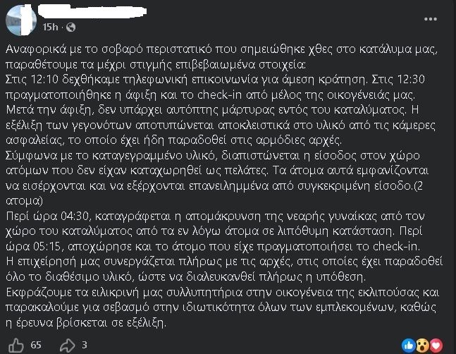 «Αναφορικά με το σοβαρό περιστατικό που σημειώθηκε χθες στο κατάλυμα μας, παραθέτουμε τα μέχρι στιγμής επιβεβαιωμένα στοιχεία: