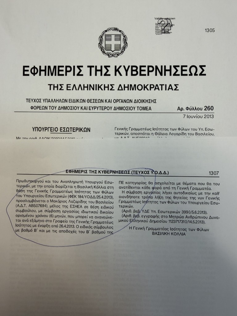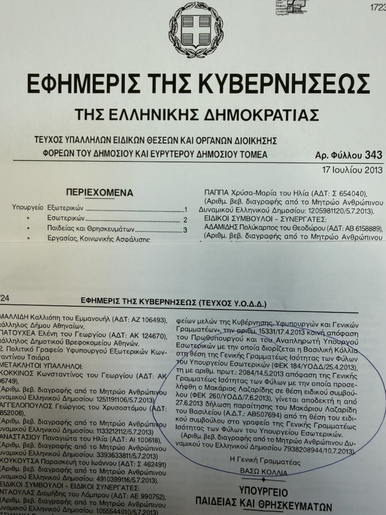 Ο πρώτος διορισμός στο Διοικητικής Μεταρρύθμισης γίνεται στις 24 Απριλίου στη Γενική Γραμματεία Ισότητας Φύλων (με γενική γραμματέα την Βάσω Κόλλια) και αφορά σε εξάμηνη σύμβαση με καθεστώς «ειδικού συμβούλου». Το ερώτημα εδώ είναι γιατί προβλέπονται αποδοχές Β’ Βαθμού της ΠΕ (πανεπιστημιακής) κατηγορίας.