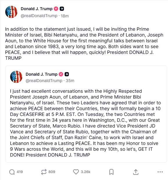 «Την Τρίτη, οι δύο χώρες συναντήθηκαν για πρώτη φορά μετά από 34 χρόνια εδώ στην Ουάσινγκτον, με τον Μεγάλο Υπουργό Εξωτερικών μας, Μάρκο Ρούμπιο. Έχω δώσει εντολή στον Αντιπρόεδρο Τζέι Ντι Βανς και τον Υπουργό Εξωτερικών Ρούμπιο, μαζί με τον Αρχηγό του Γενικού Επιτελείου Ενόπλων Δυνάμεων, Νταν Ρέιζιν Κέιν, να συνεργαστούν με το Ισραήλ και τον Λίβανο για την επίτευξη μιας Διαρκούς ΕΙΡΗΝΗΣ.