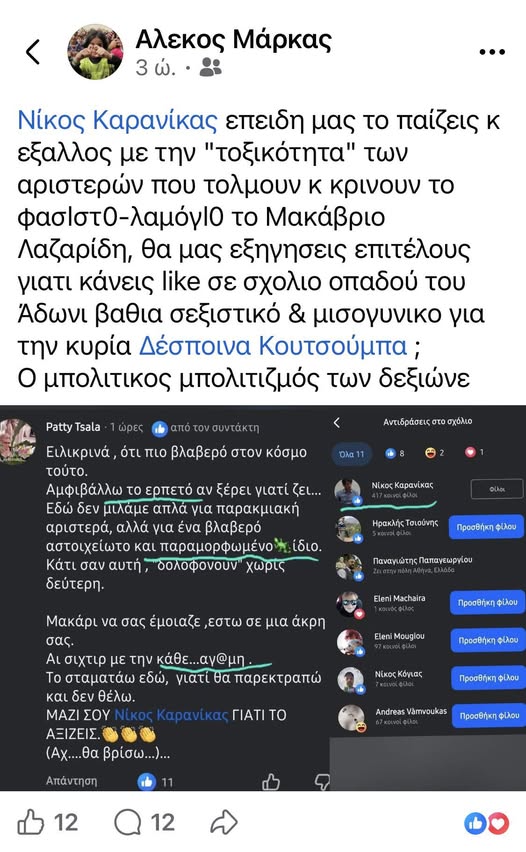 Μία ανάρτησή του, με την οποία επικρίνει την αντιπολίτευση ότι δεν κάνει σοβαρή… αντιπολίτευση, αλλά επιδίδεται στην ηθικολογία και κάνει χαβαλέ με το αν έχει πτυχίο ο Μακάριος Λαζαρίδης, ο Νίκος Καρανίκας κατάφερε να προκαλέσει και πάλι θόρυβο – και αντιδράσεις.