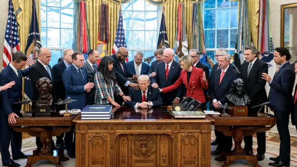 Οι εικόνες είναι ενδεικτικές: Πάστορες να επιβάλλουν τα χέρια τους στον Τραμπ μέσα στον Λευκό Οίκο, δημόσιες προσευχές με πολιτικό περιεχόμενο και μια συνεχής επίκληση του Θεού ως πολιτικού συμμάχου. Δεν πρόκειται για απλό συμβολισμό, αλλά για πολιτική στρατηγική.