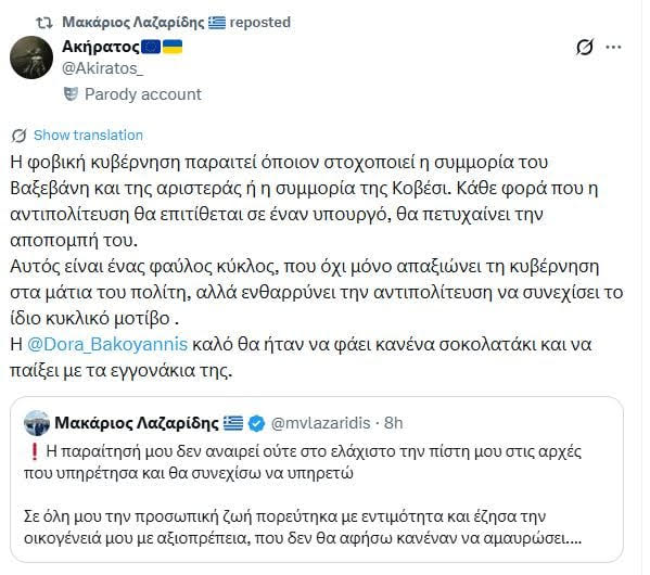 Το σχόλιο αυτό επέκρινε τη «φοβική κυβέρνηση» που απομάκρυνε έναν υπουργό υποκύπτοντας στις απαιτήσεις της Αριστεράς και της… Κοβέσι, αλλά καλούσε υποτιμητικά την κυρία Μπακογιάννη… «να φάει κανά σοκολατάκι και να ασχοληθεί με τα εγγονάκια της».