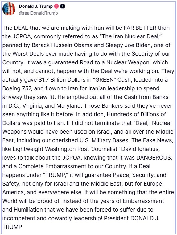 Σε νέα ανάρτηση ο πρόεδρος των ΗΠΑ Ντόναλντ Τραμπ, ισχυρίζεται ότι η συμφωνία που «συνάπτουν οι ΗΠΑ με το Ιράν θα είναι ΠΟΛΥ ΚΑΛΥΤΕΡΗ από την JCPOA», την ιστορική πυρηνική συμφωνία που υπεγράφη από την ιρανική κυβέρνηση και τις παγκόσμιες δυνάμεις, συμπεριλαμβανομένων των ΗΠΑ, το 2015.