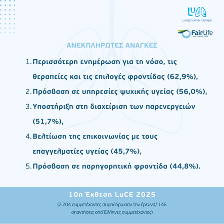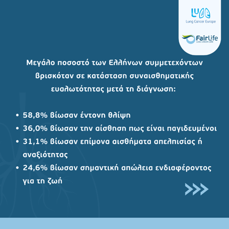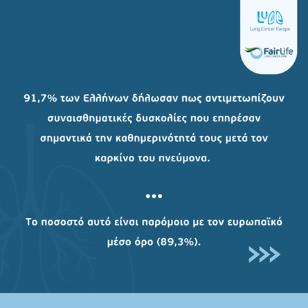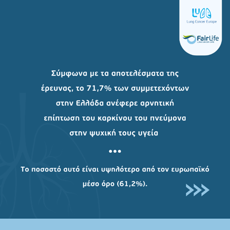 Συγκεκριμένα επτά στους δέκα ασθενείς με καρκίνο πνεύμονα στην Ελλάδα επηρεάζονται ψυχικά μετά τη διάγνωση, περίπου 6 στους 10 αναφέρουν σημαντική επίπτωση στην οικογένεια, στα οικονομικά ή στην εργασία, ενώ το 68,3% μένει χωρίς ψυχολογική υποστήριξη. Η παραπάνω δυσοίωνη κατάσταση περιγράφεται στη 10η πανευρωπαϊκή έρευνα με τίτλο: «Καρκίνος του Πνεύμονα και Ψυχική Υγεία: Πώς βιώνουν τη νόσο οι ασθενείς και οι φροντιστές» που κοινοποιεί η «FairLife Φροντίδα και Πρόληψη για τον Καρκίνο του Πνεύμονα», πλήρες και ενεργό μέλος του Lung Cancer Europe (LuCE).