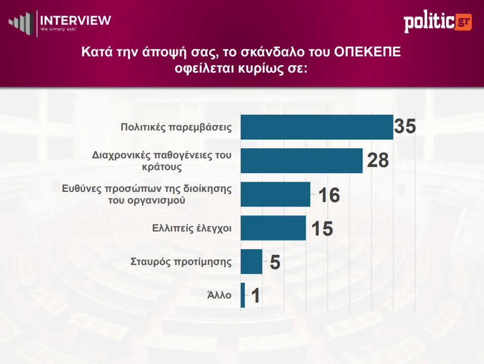 Σχετικά με το θέμα του ΟΠΕΚΕΠΕ, το 35% θεωρεί ότι το ζήτημα προκύπτει από πολιτικές παρεμβάσεις, ενώ το 28% το συνδέει με διαχρονικές παθογένειες του κράτους.