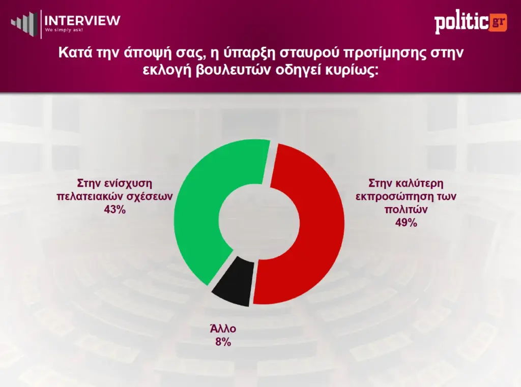Τα στοιχεία δείχνουν ότι ο σταυρός παραμένει σημαντικός για την επιλογή προσώπων, αλλά συνοδεύεται και από επιφυλάξεις ως προς τον τρόπο που λειτουργεί στην πράξη. Συγκεκριμένα, το 49% θεωρεί ότι οδηγεί σε καλύτερη εκπροσώπηση, ενώ το 43% εκτιμά ότι ενισχύει πελατειακές σχέσεις. Ένα 8% δίνει άλλες απαντήσεις.