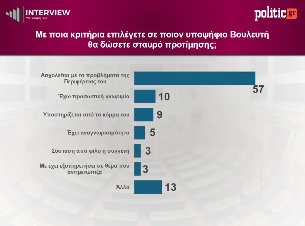 Το βασικό κριτήριο επιλογής υποψηφίου βουλευτή φαίνεται να είναι η ενασχόληση με τα προβλήματα της περιοχής, καθώς το 57% δηλώνει ότι ψηφίζει με αυτό το κριτήριο.