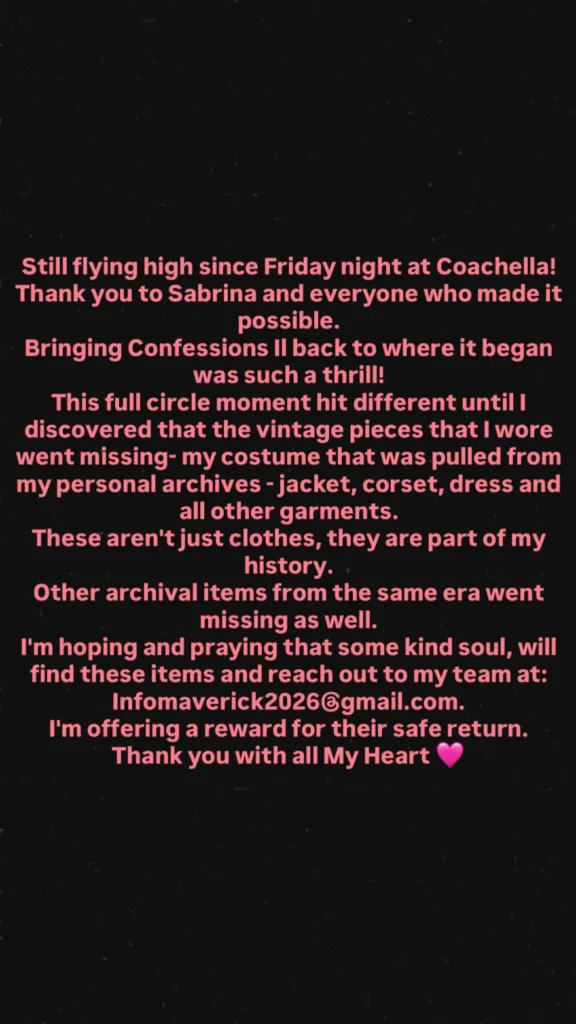 «Πετάω ακόμα ψηλά από την Παρασκευή το βράδυ στο Coachella! Ευχαριστώ τη Σαμπρίνα και όλους όσους το έκαναν δυνατό. Το να επαναφέρω το Confessions II εκεί που ξεκίνησε ήταν τόσο συναρπαστικό. Αυτή η στιγμή ήταν ξεχωριστή μέχρι που ανακάλυψα ότι τα vintage κομμάτια που φορούσα είχαν χαθεί – η στολή μου που ανέσυρα από το προσωπικό μου αρχείο – το σακάκι, ο κορσές, το φόρεμα και όλα τα άλλα ρούχα. Αυτά δεν είναι απλώς ρούχα, είναι μέρος της ιστορίας μου. Άλλα αρχειακά αντικείμενα από την ίδια εποχή χάθηκαν επίσης. Ελπίζω και προσεύχομαι ότι κάποια καλή ψυχή θα βρει αυτά τα αντικείμενα και θα επικοινωνήσει με την ομάδα μου. Προσφέρω μια ανταμοιβή για την ασφαλή επιστροφή τους. Σας ευχαριστώ με όλη μου την καρδιά» έγραψε η Μαντόνα σε story στο Instagram.