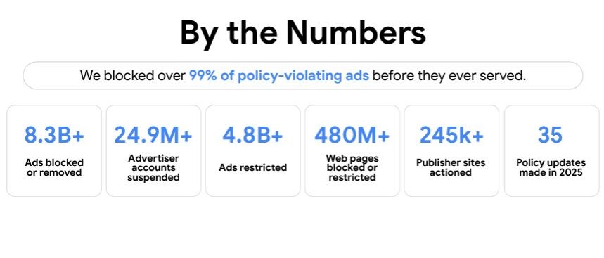 Η εξέλιξη αυτή αναδεικνύεται στην ετήσια έκθεση ασφάλειας διαφημίσεων της Google για το 2025 σύμφωνα με την οποία χάρη σε εργαλεία του Gemini της – του μοντέλου τεχνητής νοημοσύνης που ανέπτυξε και εφαρμόζει – αποκλείστηκαν ή καταργήθηκαν περισσότερες από 8,3 δισ. διαφημίσεις, με ποσοστό άνω του 99% να αποτρέπεται πριν καν προβληθεί στους χρήστες.