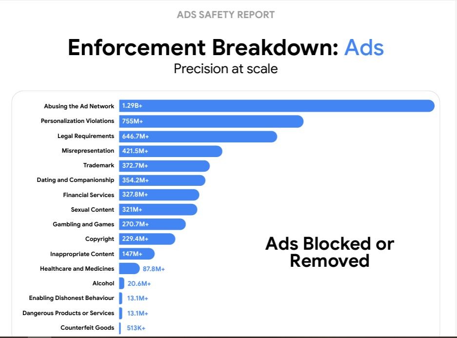 Τέθηκαν επίσης, σε αναστολή περισσότεροι από 24,9 εκατομμύρια λογαριασμοί διαφημιζομένων, ενώ περιορίστηκαν 4,8 δισ. διαφημίσεις και πάνω από 480 εκατ. λογαριασμοί. Οι συχνότερες παραβάσεις αφορούσαν κατάχρηση διαφημιστικού δικτύου, εμπορικά σήματα και παραπλανητικό περιεχόμενο.