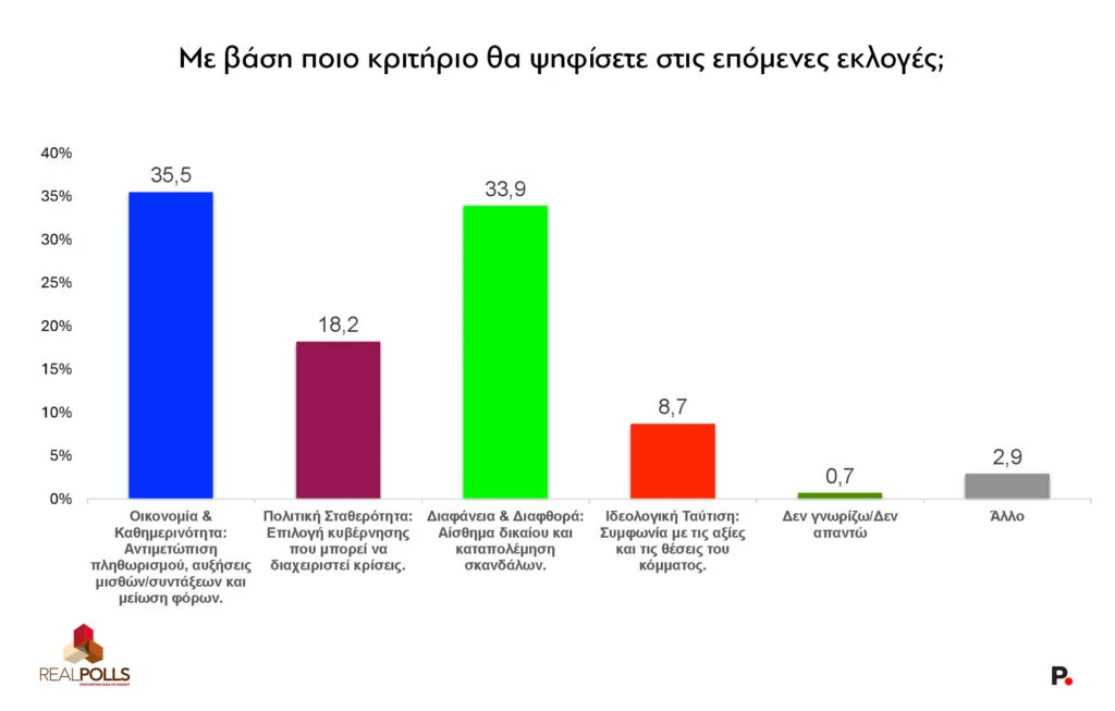 Στην ερώτηση για το κριτήριο ψήφου στις επόμενες εκλογές, όποτε κι αν γίνουν αυτές, η κατάταξη είναι επίσης ενδιαφέρουσα: πρώτη με 35,5% είναι η οικονομία και η καθημερινότητα (πληθωρισμός, μισθοί, φόροι), δεύτερη με 33,9% η διαφάνεια και η διαφθορά. Η πολιτική σταθερότητα ακολουθεί στο 18,2%, ενώ η ιδεολογική ταύτιση καταλαμβάνει μόλις το 8,7%. Πρόκειται για μια αξιοπρόσεκτη εξέλιξη. Η ακρίβεια και η διαφθορά συγκεντρώνουν αθροιστικά σχεδόν το 70% του εκλογικού σώματος. Η πολιτική σταθερότητα, που ιστορικά συνιστά ατού της ΝΔ, έχει υποχωρήσει ως κριτήριο. Μια ερμηνεία είναι ότι ίσως για πρώτη φορά η «σταθερότητα» της ΝΔ έχει αποκτήσει και αρνητική χροιά, λόγω της πολυετούς διακυβέρνησης και της κόπωσης του εκλογικού σώματος. Εφόσον ο προεκλογικός αγώνας διεξαχθεί με τέτοια ζυγίσματα –ακρίβεια ή και διαφθορά– και και όχι στο πεδίο «σταθερότητα ή χάος», θα κριθεί σε πεδία που δυσκολεύουν την κυβέρνηση.
