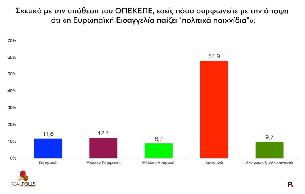 Ένα άλλο επιμέρους πρόβλημα για την κυβέρνηση είναι η απόρριψη από τους πολίτες του αφηγήματος που εξυφάνθηκε πρόσφατα από κυβερνητικούς αξιωματούχους για τον πολιτικά παράξενο ρόλο της Ευρωπαϊκής Εισαγγελίας με την υπόθεση του ΟΠΕΚΕΠΕ –θέση στην οποία επιμένει, για παράδειγμα, ο υπουργός Υγείας και αντιπρόεδρος της ΝΔ, Αδωνις Γεωργιάδης. Στην ερώτηση αν συμφωνούν ότι «η Ευρωπαϊκή Εισαγγελία παίζει πολιτικά παιχνίδια» στην υπόθεση ΟΠΕΚΕΠΕ, μόλις το 23,7% συμφωνεί (11,6% «συμφωνώ» και 12,1% «μάλλον συμφωνώ»), ενώ το 66,6% διαφωνεί: εντυπωσιακά, το 57,9% επιλέγει το κατηγορηματικό «διαφωνώ».