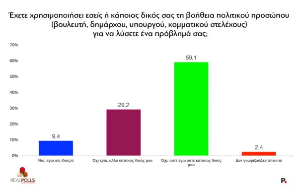 Από τα πιο ενδιαφέροντα ευρήματα της έρευνας είναι οι απαντήσεις στην ερώτηση για την προσωπική εμπειρία πολιτικής διαμεσολάβησης, του λεγόμενου ρουσφετιού, το οποίο επανήλθε με εμφατικό τρόπο στη δημόσια σφαίρα μετά τις τελευταίες αποκαλύψεις με τους εμπλεκόμενους πολιτικούς στην υπόθεση του ΟΠΕΚΕΠΕ: Eνα 9,4% των ερωτηθέντων δηλώνει ευθέως ότι το έχει χρησιμοποιήσει προσωπικά, ένα 29,2% ότι το έχει χρησιμοποιήσει κάποιος δικός του· συνολικά, σχεδόν τέσσερις στους δέκα πολίτες (38,6%) έχουν άμεση εμπειρία από το ρουσφέτι και το δηλώνουν. Το 59,1% απαντά αρνητικά.