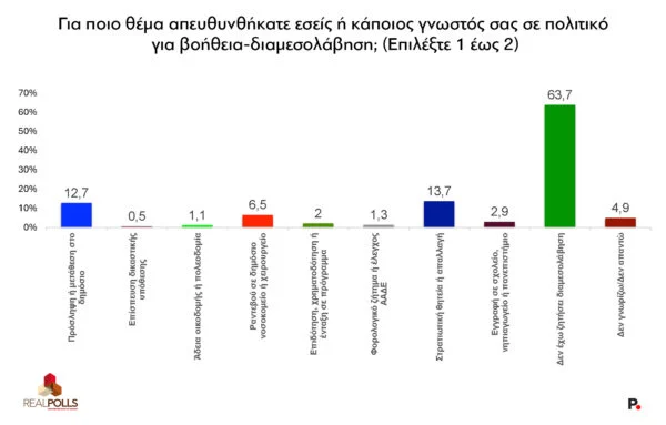 Το σχεδόν 40% είναι εντυπωσιακό όχι τόσο ως αριθμός καθαυτός (το φαινόμενο είναι γνωστό) αλλά ως αυθόρμητη παραδοχή σε έρευνα. Οι πολίτες δηλαδή δεν θεωρούν πλέον την προσφυγή σε πολιτικό για παρέμβαση ως κάτι που πρέπει να αρνηθούν — πρόκειται για μια κανονικοποιημένη πρακτική, με μηδαμινό ηθικό κόστος. Τα ζητήματα για τα οποία γίνεται η διαμεσολάβηση είναι επίσης αποκαλυπτικά: πρώτη η στρατιωτική θητεία με 13,7%, δεύτερη η πρόσληψη/μετάθεση στο Δημόσιο με 12,7%, τρίτο το ραντεβού σε νοσοκομείο με 6,5%.