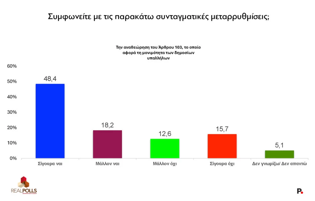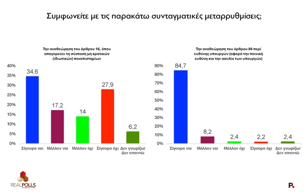 Στον αντίποδα πάντως, η πρόταση για αναθεώρηση του άρθρου 16 που απαγορεύει τα ιδιωτικά πανεπιστήμια εξακολουθεί να διχάζει: συγκεντρώνει μεν θετική πλειοψηφίαστο 51,8% υπέρ (34,6% και 17,2%) αλλά ένα 41,9% τάσσεται κατά.