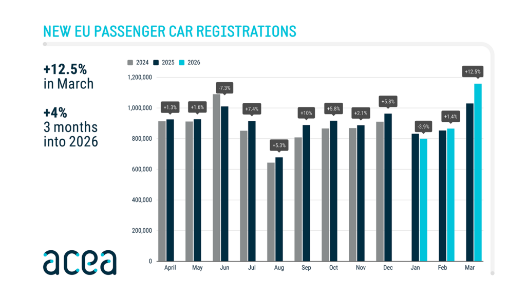 Το πρώτο τρίμηνο του 2026, οι ταξινομήσεις νέων αυτοκινήτων στην ΕΕ αυξήθηκαν κατά 4%, κυρίως λόγω της ισχυρής απόδοσης του Μαρτίου.