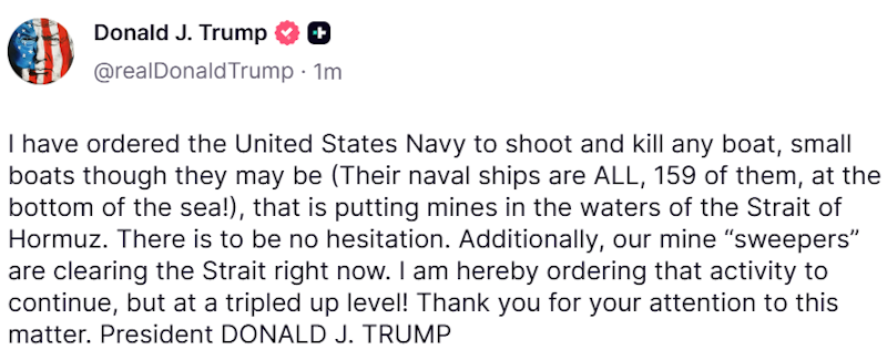 «Έχω διατάξει το Πολεμικό Ναυτικό των Ηνωμένων Πολιτειών να πυροβολεί και να σκοτώνει κάθε σκάφος, αν και μικρά σκάφη (τα πολεμικά τους πλοία βρίσκονται ΟΛΑ, 159 από αυτά, στον πυθμένα της θάλασσας!), που τοποθετεί νάρκες στα νερά του Στενού του Ορμούζ. Δεν υπάρχει κανένας δισταγμός.