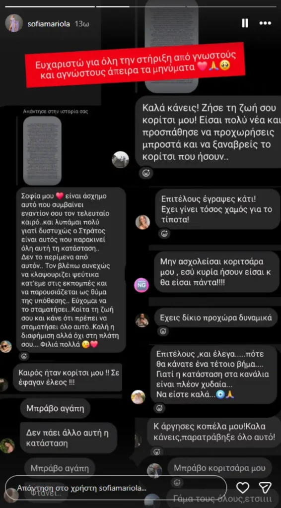Με μια ανάρτησή της στα social media, η Σοφία Μαριόλα θέλησε να ευχαριστήσει για τη στήριξη που δέχτηκε από γνωστούς και αγνώστους , όπως είπε, δημοσιεύοντας μάλιστα κάποια από τα μηνύματα που έλαβε μετά το εξώδικο που απέστειλε μέσω του κηγόρου της στα ΜΜΕ για τον χωρισμό της από τον Στράτο Τζώρτζογλου.