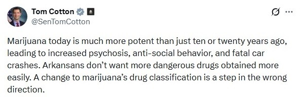 «Η μαριχουάνα σήμερα είναι πολύ πιο ισχυρή από ό,τι πριν από δέκα ή είκοσι χρόνια, οδηγώντας σε αυξημένη ψύχωση, αντικοινωνική συμπεριφορά και θανατηφόρα τροχαία ατυχήματα», δήλωσε ο Κότον σε ανάρτησή του στα μέσα κοινωνικής δικτύωσης. «Μια αλλαγή στην ταξινόμηση της μαριχουάνας ως ναρκωτικού είναι ένα βήμα προς τη λάθος κατεύθυνση».