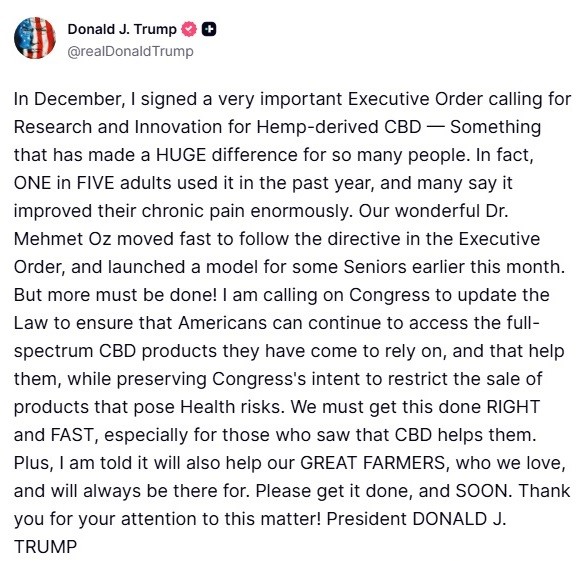 Την Πέμπτη, ο Τραμπ δήλωσε ότι πρέπει να γίνουν περισσότερα. Σε μια ανάρτηση στο Truth Social, κάλεσε το Κογκρέσο να επικαιροποιήσει τη νομοθεσία ώστε να διασφαλιστεί η πρόσβαση στο «πλήρες φάσμα» των προϊόντων CBD «διατηρώντας παράλληλα την πρόθεση του Κογκρέσου να περιορίσει την πώληση προϊόντων που ενέχουν κινδύνους για την υγεία».