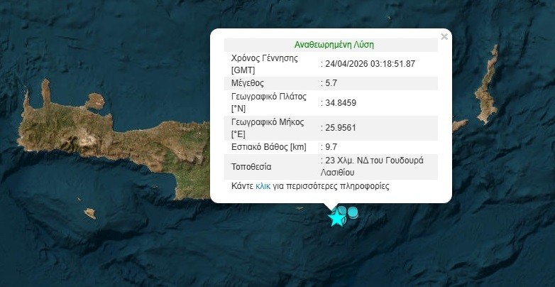 Μεγάλος σεισμός 5,7 βαθμών της κλίμακας Ρίχτερ σημειώθηκε σήμερα το πρωί (24/4/2026) στα ανοιχτά της Κρήτης και συγκεκριμένα νότια του Λασιθίου.