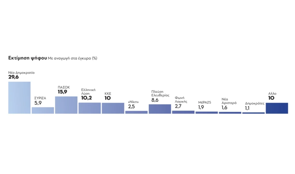 Αντιθέτως η Πλεύση Ελευθερίας έχει κι άλλες απώλειες και είναι στο 6,9%. Στην τρίτη θέση είναι η Ελληνική Λύση µε 8,2%, και στην τέταρτη το ΚΚΕ με 8%.