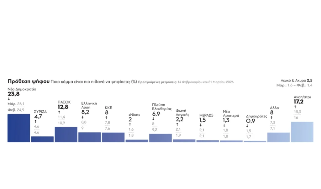 Νέα ∆ηµοκρατία 23,8 (Μάρ. 26,1 Φεβ. 24,9)