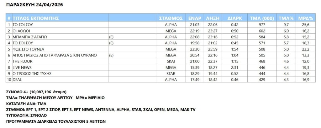 Ανατροπή στη μάχη των καναλιών για την τηλεθέαση – Πρώτο σε προτίμηση το Mega την Παρασκευή (24/4)