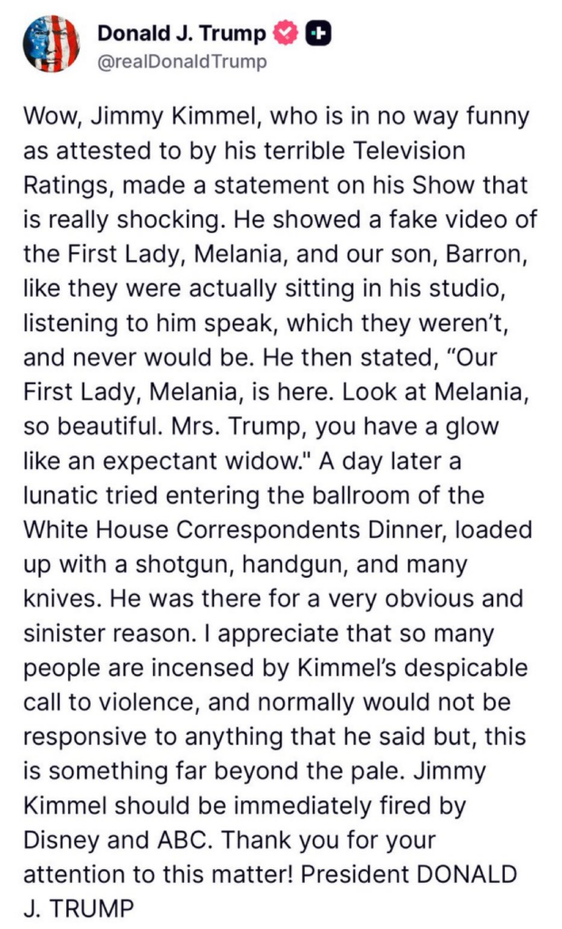 «Ουάου, ο Τζίμι Κίμελ, ο οποίος δεν είναι καθόλου αστείος, όπως αποδεικνύεται από την απαίσια τηλεθέαση που έχει, έκανε μια δήλωση στην εκπομπή του που είναι πραγματικά σοκαριστική. Έδειξε ένα ψεύτικο βίντεο της Πρώτης Κυρίας, Μελάνια, και του γιου μας, Μπάρον, σαν να κάθονταν στην πραγματικότητα στο στούντιό του, ακούγοντάς τον να μιλάει, που δεν ήταν και δεν θα ήταν ποτέ. Στη συνέχεια δήλωσε: “Η Πρώτη μας Κυρία, Μελάνια, είναι εδώ. Κοιτάξτε τη Μελάνια, τόσο όμορφη. Κυρία Τραμπ, λάμπετε σαν μέλλουσα χήρα”. Μια μέρα αργότερα, ένας τρελός προσπάθησε να μπει στην αίθουσα χορού του δείπνου των Ανταποκριτών του Λευκού Οίκου, φορτωμένος με ένα κυνηγετικό όπλο, ένα πιστόλι και πολλά μαχαίρια. Ήταν εκεί για έναν πολύ προφανή και δυσοίωνο λόγο. Καταλαβαίνω ότι τόσοι πολλοί άνθρωποι είναι εξοργισμένοι από την απεχθή έκκληση του Κίμελ για βία και κανονικά δεν θα αντιδρούσαν σε τίποτα από όσα έλεγε, αλλά αυτό είναι κάτι πολύ πέρα από τα όρια. Ο Τζίμι Κίμελ θα έπρεπε να απολυθεί αμέσως από την Disney και το ABC. Σας ευχαριστώ για την προσοχή σας σε αυτό το θέμα! Πρόεδρος ΝΤΟΝΑΛΝΤ ΤΖ. ΤΡΑΜΠ».