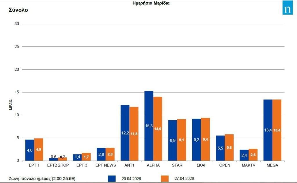 Το Open είχε λίγο καλύτερη επίδοση συγκριτικά με την προπερασμένη Δευτέρα, όπως επίσης και η ΕΡΤ1, η οποία έφθασε μια «ανάσα» από το 5%.