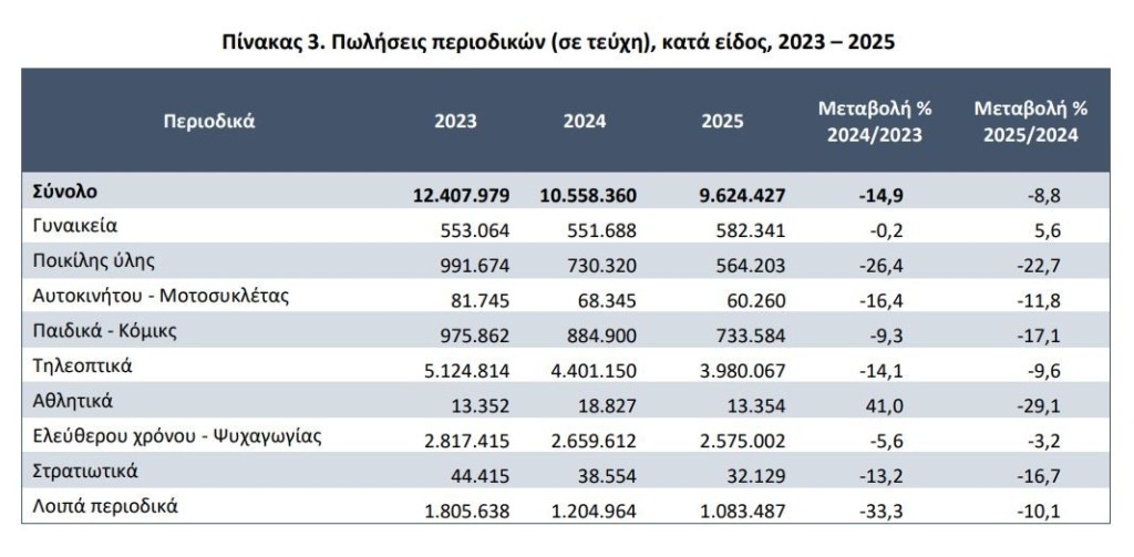 Σημαντικές μεταβολές σε απόλυτες τιμές, παρατηρούνται στις πωλήσεις των αθλητικών περιοδικών, των περιοδικών ποικίλης ύλης καθώς και των τηλεοπτικών εντύπων και των παιδικών περιοδικών, στις οποίες καταγράφεται μείωση κατά 29,1%, 22,7%, 9,6% και 17,1% αντίστοιχα, σε σχέση με το 2024.