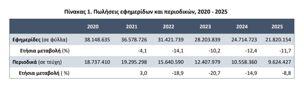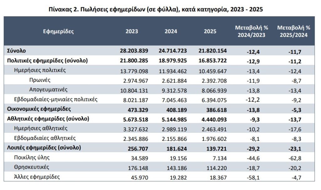 Το 2025 οι καθημερινές πρωινές εφημερίδες πούλησαν όλες μαζί 229.176 φύλλα λιγότερα από το ότι είχαν πουλήσει το 2024 (μεταβολή -8,7%).