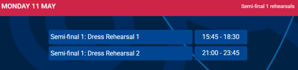 Κατόπιν, θα ακολουθήσουν οι πρόβες με τα κοστούμια του Α’ Ημιτελικού, οι οποίες έχουν οριστεί για τη Δευτέρα 11 Μαΐου, με δύο γενικές πρόβες στις 15:45–18:30 και 21:00–23:45, ενώ την Τρίτη 12 Μαΐου θα πραγματοποιηθεί η τρίτη dress rehearsal από τις 15:00 έως τις 17:45. Το ίδιο βράδυ, στις 21:00, θα διεξαχθεί ο πρώτος Ημιτελικός της Eurovision, όπου και η Ελλάδα θα διεκδικήσει την πρόκρισή της στον μεγάλο τελικό του Σαββάτου.
