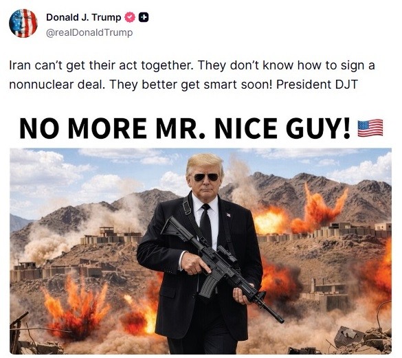 Σε ανάρτησή του στο Truth Social, ο Τραμπ ανέβασε φωτογραφία στην οποία εμφανίζεται ο ίδιος να κρατά ένα τουφέκι σαν αυτό των στρατιωτών των ΗΠΑ, ενώ πίσω του – σε περιβάλλον που θυμίζει το Ιράν – γίνονται εκρήξεις σε πετρελαϊκές εγκαταστάσεις, και πάνω από τη φωτογραφία έγραψε «Τέλος το καλό παιδί». Ο πρόεδρος των ΗΠΑ συμπλήρωσε ότι «το Ιράν δεν μπορεί να βρει τον δρόμο του. Δεν ξέρουν πώς να υπογράψουν μια μη πυρηνική συμφωνία. Καλύτερα να γίνουν έξυπνοι σύντομα!».