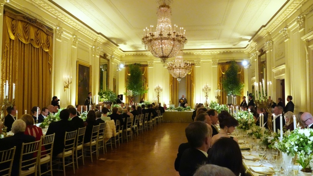 Μετά την ολοκλήρωση των ομιλιών, ο πρόεδρος των ΗΠΑ και ο Βρετανός μονάρχης ύψωσαν τα ποτήρια τους, σηματοδοτώντας το τέλος του επίσημου σκέλους της βραδιάς.